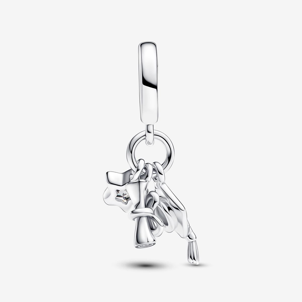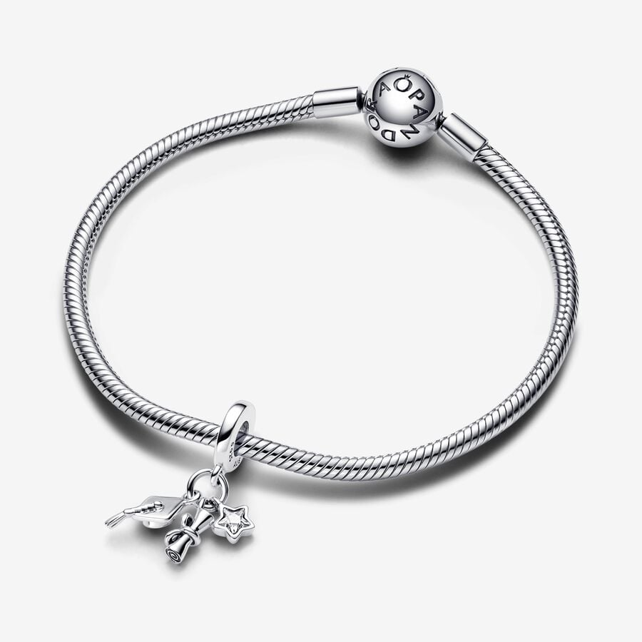 Commemorate your accomplishment with the 2024 Graduation Triple Dangle Charm, crafted from sterling silver to symbolize your achievement. A star-shaped cubic zirconia shines alongside a graduation cap with a playful tassel, while a beautifully detailed scroll, tied with a ribbon, adds a special touch. The elegant swirls represent a rolled diploma, and the '2024' engraving on the bail offers a personalized detail. This charm is a perfect reminder of your hard work and success throughout your educational journey.