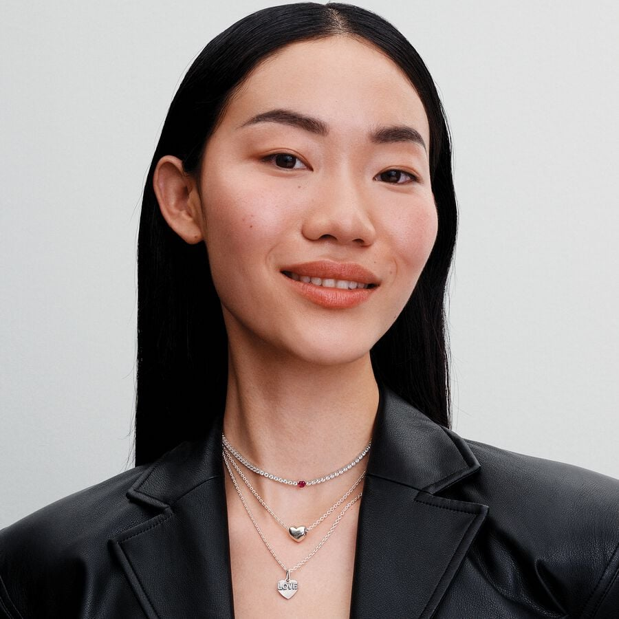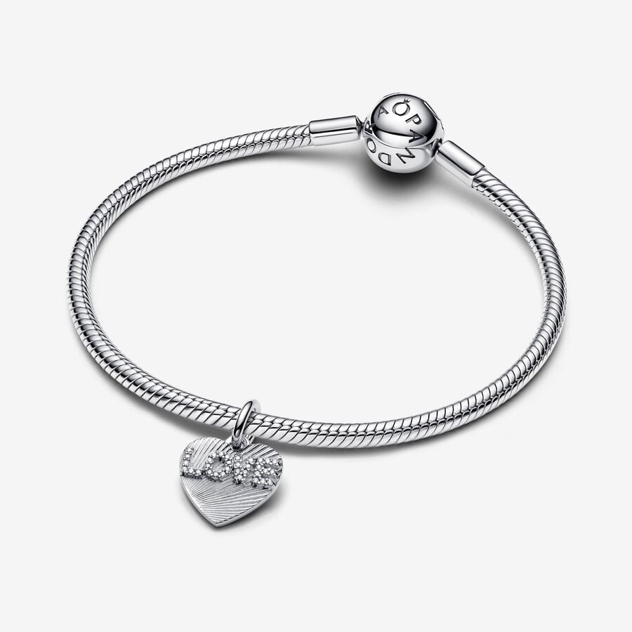 Express your love this holiday season with our Love Heart Dangle Charm. Crafted from sterling silver, this dual-sided charm features the word "LOVE" adorned with shimmering stones on the front.