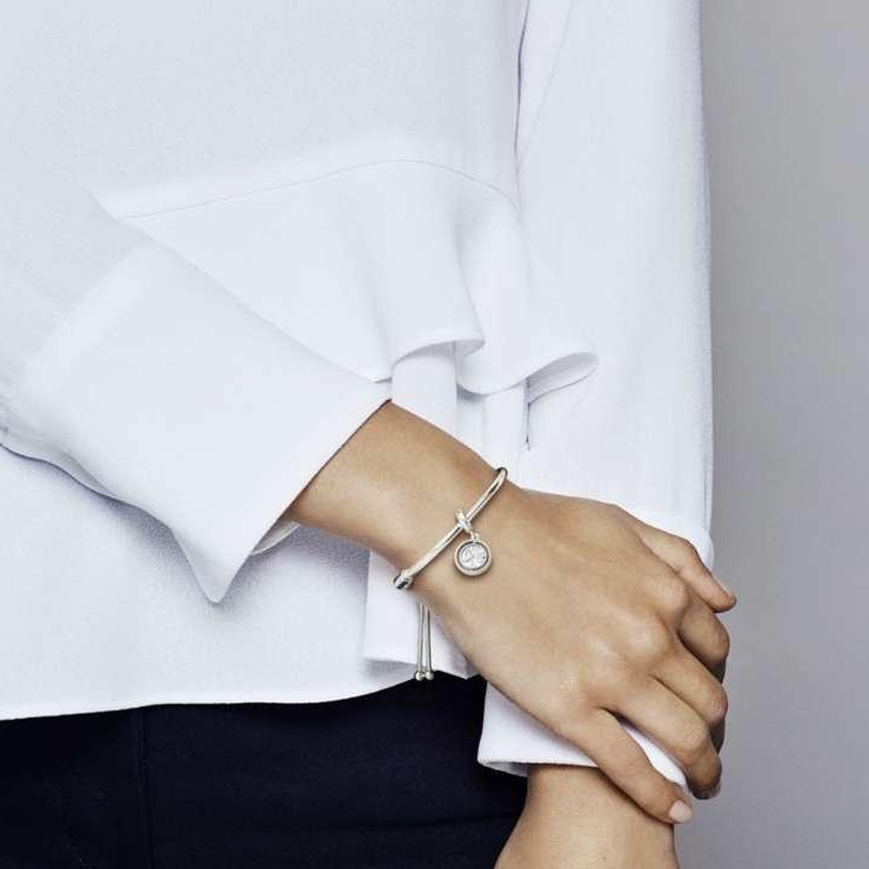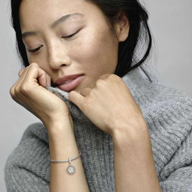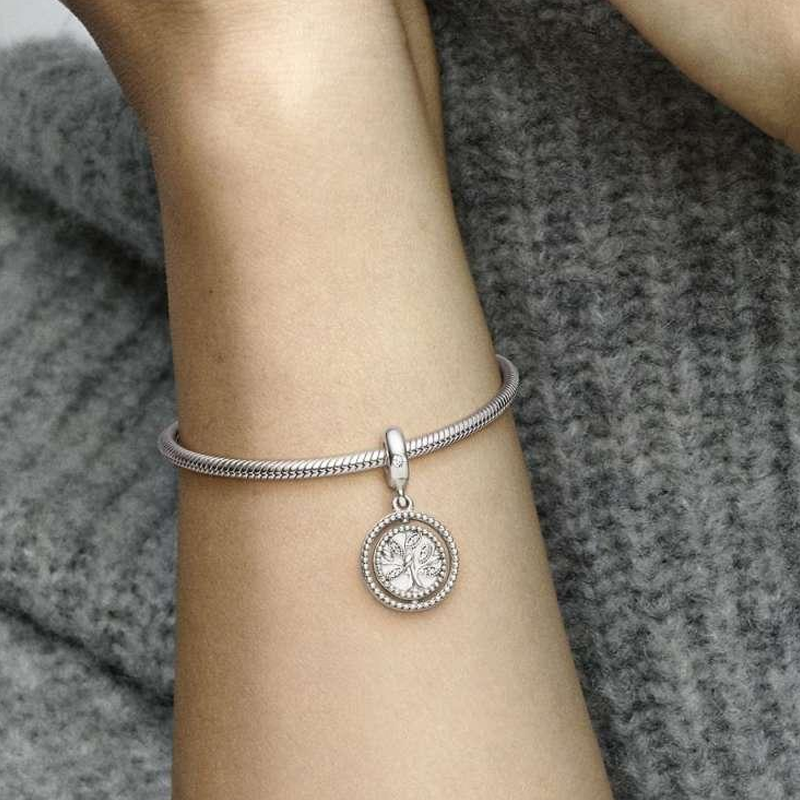 The family tree symbolizes the story of your roots and the path ahead. Embrace your unique journey with this medallion-style dangle charm, crafted to be worn on moments bracelets and bangles. Meticulously hand-finished in sterling silver, it features a rotating centerpiece adorned with a beautifully detailed family tree and the heartfelt engraving "Family is a circle of love." Delicate white enamel and sparkling cubic zirconia stones add a touch of elegance to this meaningful piece.